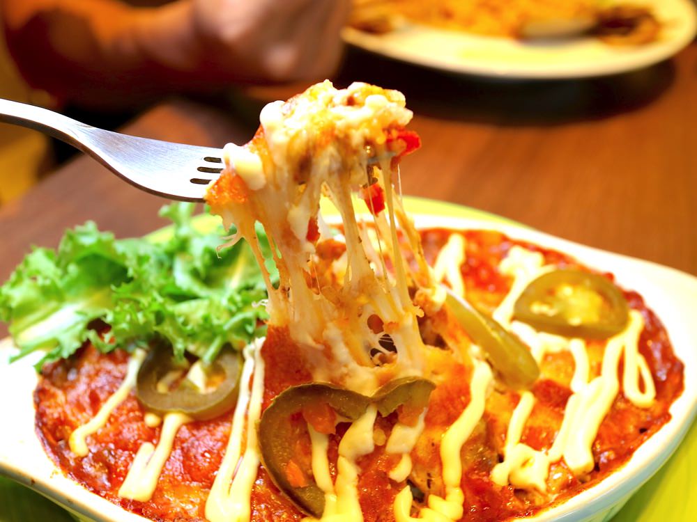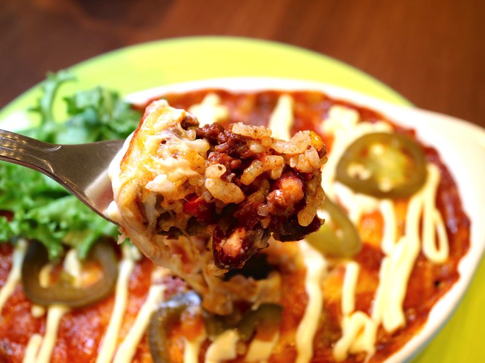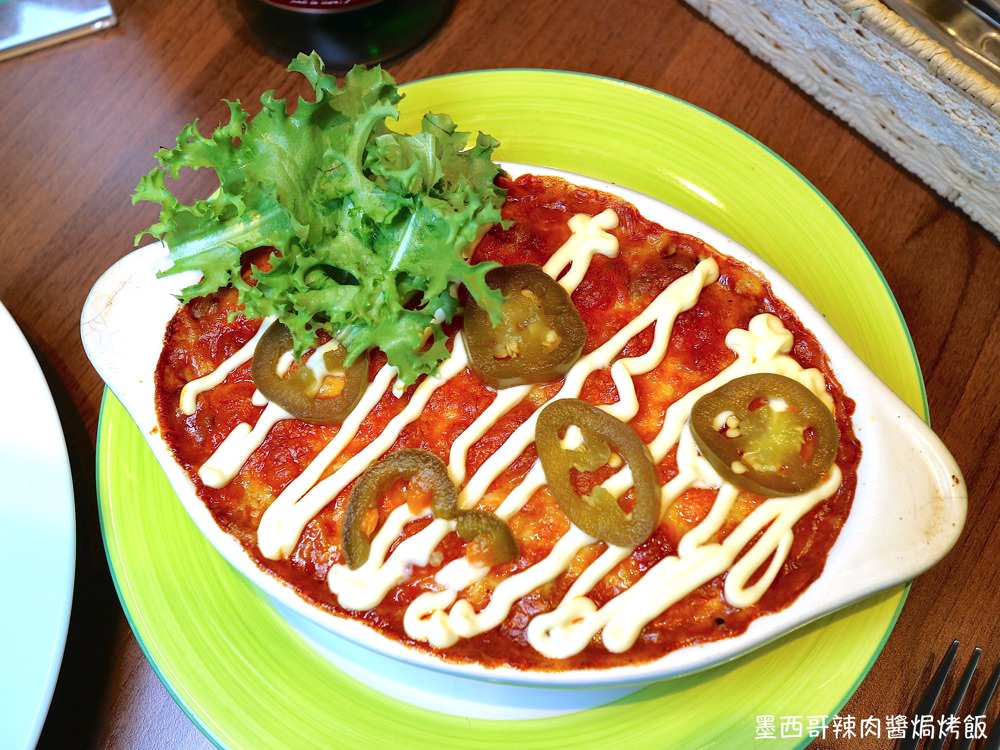 墨西哥辣肉醬焗烤飯,是店家新研發的餐點。外表烤的焦黃,感覺美味極了!