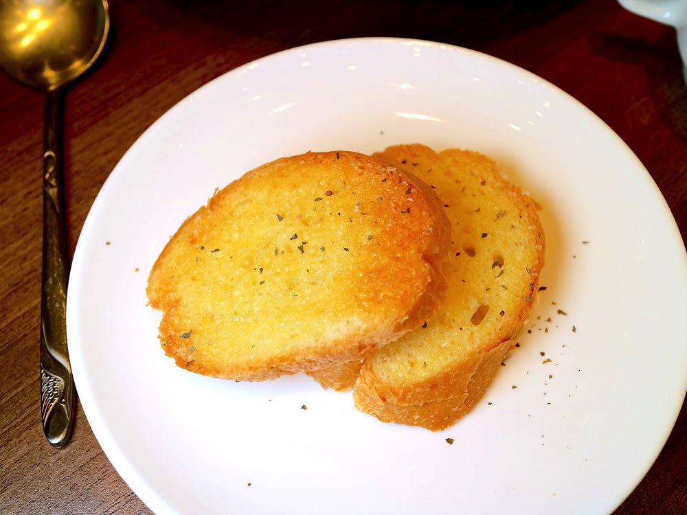 麵包,是香烤得非常酥脆的蒜香麵包,上方撒了糖粒,吃起來帶些甜味,搭配濃湯也好好吃~