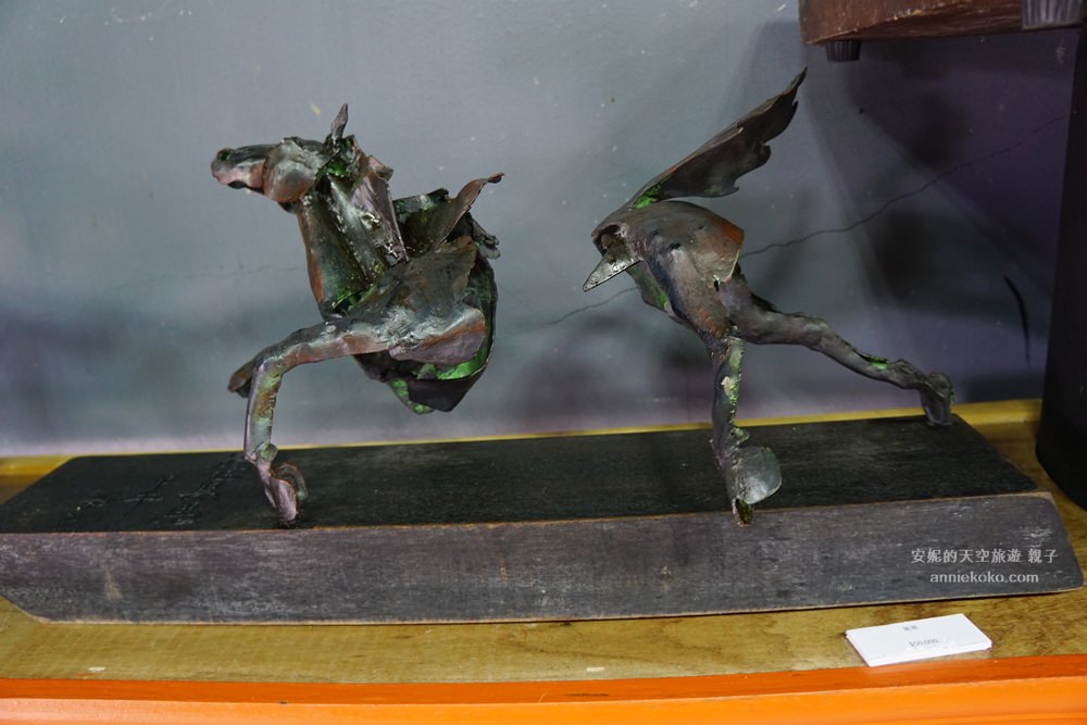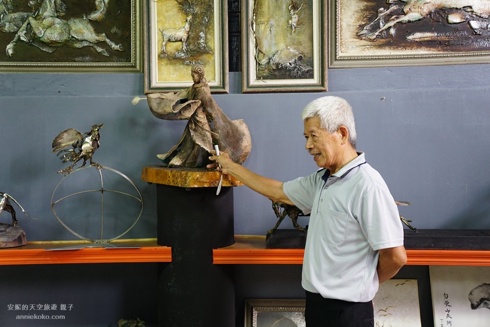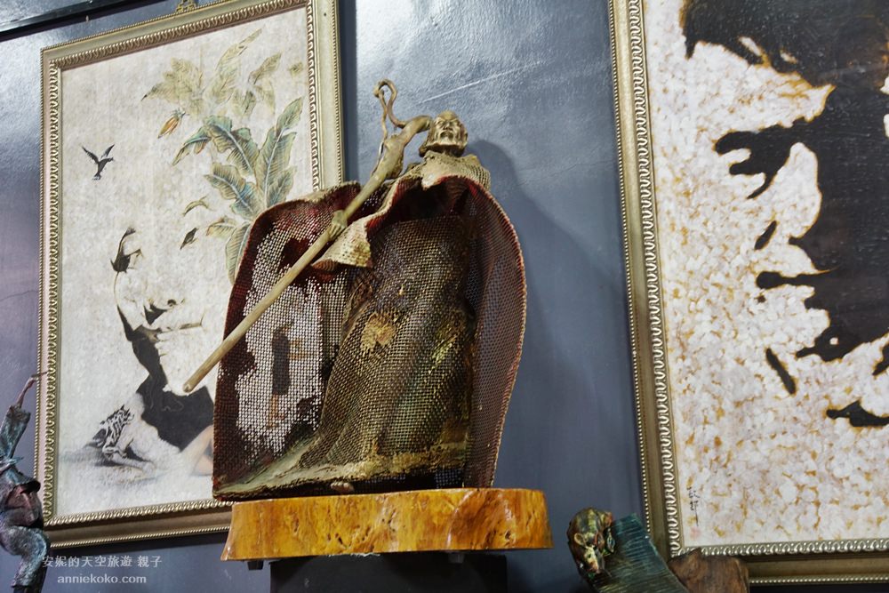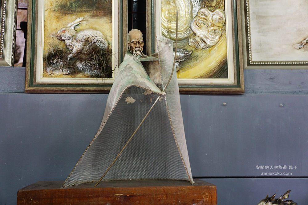 這間泥畫屋的每個角落都要讓我大眼界,不管是山坡上的大佛,或是比人還要巨大的大鵰,還是泥塑人像,在在都神奇的如電影道具般的不可思議,這些都是出自於楊敏郎老師之手。楊敏郎老師創作不拘泥在任何材料,金屬網、水泥都能巧妙的製作出不同的作品,各種歷史人物以及歷史故事的呈現在他巧手中一一呈現,老師不僅畫作強、泥塑強,還很會寫詩,根本就是一位生活裡的藝術家,最神奇的是他的畫中畫,每一畫第一眼跟第二眼都有不同的寓意。