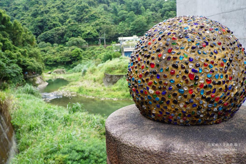 旁邊的橋也相當特別,用七彩琉璃珠點綴,與蜿蜒的石碇溪互望,很有原始樸實的味道。