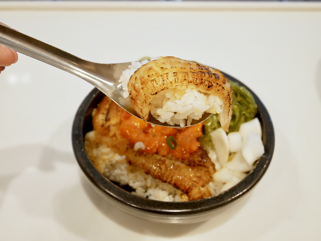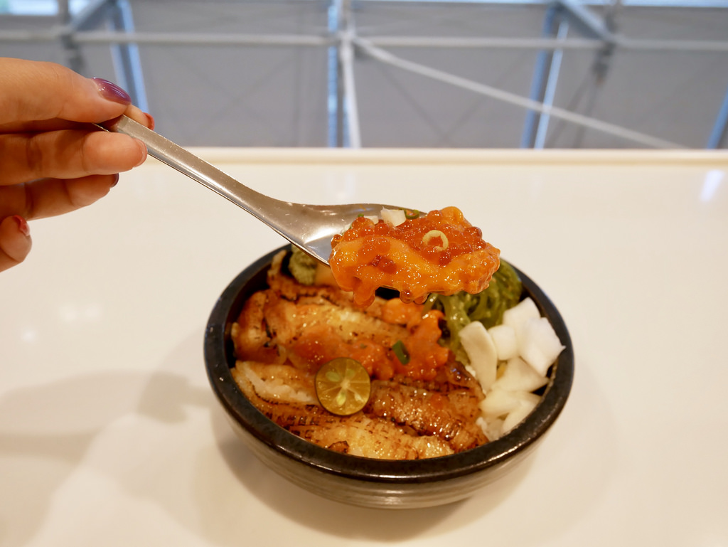 上層的海膽很順口,跟一般平價不講究品質只追求量的丼飯比,這海膽稱的上有80分,有甜味