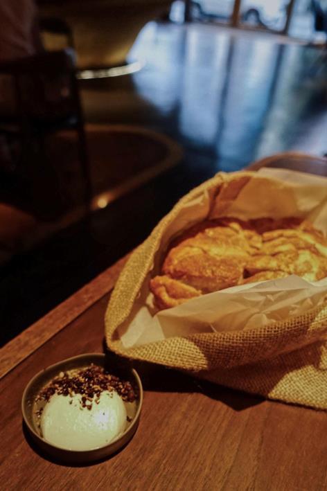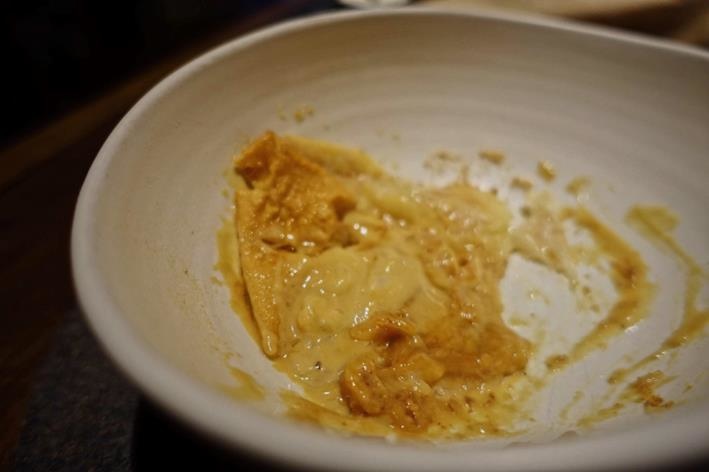 一個從洋蔥湯為發想的非湯品料理.洋蔥做成的麵糰上像洋蔥湯一樣覆蓋了好大的一片起司,上桌後服務生會"用手"拿著短棍麵包現場刨出麵包粉(也提醒我們麵包顆粒很大會噴出來,但跟我想像中的非常不一樣….等等到最後再說吧)…以為敲開後會流出濃濃的洋蔥湯.原來比較像是包餡麵包的概念,裡面填充著超洋蔥,洋蔥泥,洋蔥煉乳,幾本上就是一堆糊糊跟嬰兒食品一樣的東西