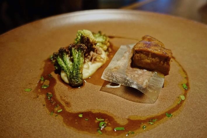 鴨肉其實就是在白昆布下面,非常小一塊,兩口分量左右吧.鴨肝還是一個我不吃的東西…冰涼的白昆布讓小小的鴨胸肉只剩下餘溫…綠花椰加白花椰泥的作法,沒甚麼創意可言…唯一令人讚賞的應該是用BASAMICO醋跟鴨油調製的醬汁了..