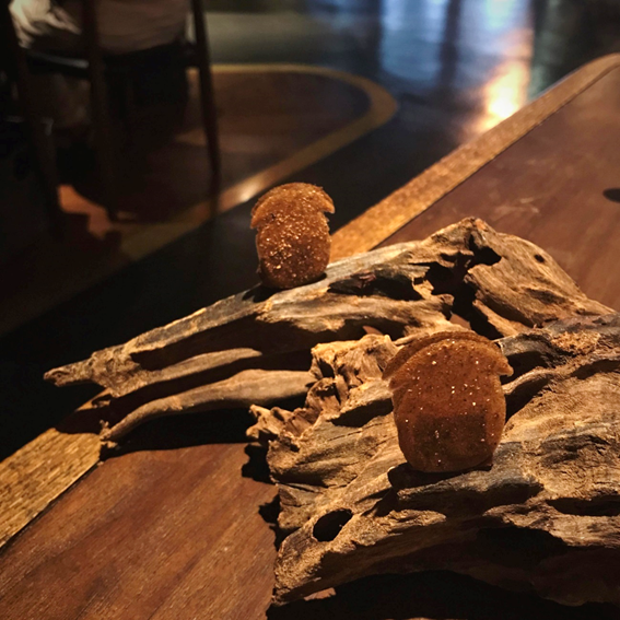 到了最後主廚招待小點才讓我感覺得台灣靈魂法式手法…薄脆到透光的脆皮,是用牛肝菌和松露做出來的,中間夾心的則是台灣紅茶做出的巧克力,放在木頭上像式小小的香菇等人採擷.