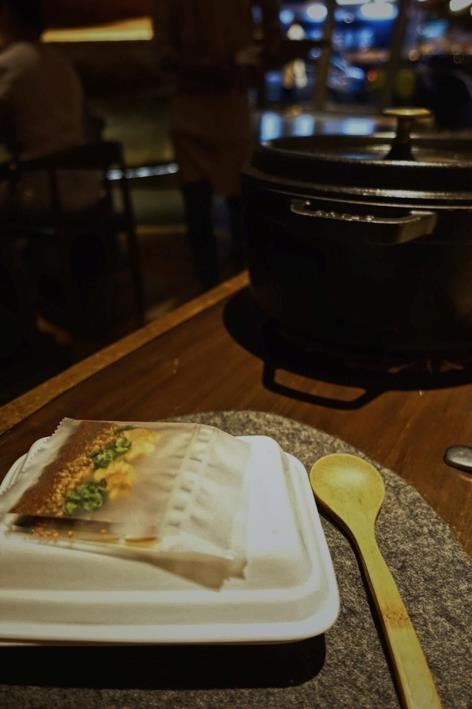 突然間服務生送上了一個束著紅色橡皮筋,(不是緞帶,不是繩子就是平常綁便當盒的橡皮筋)的便當盒,還有一個看起來很重的黑色鐵鍋.