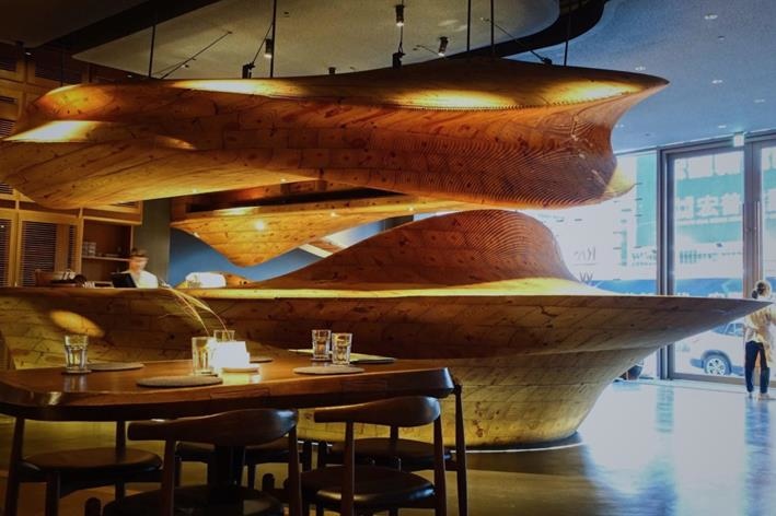 (不管食物服務如何,每每看到這個大型木作的船型吧台還是很美阿….)
