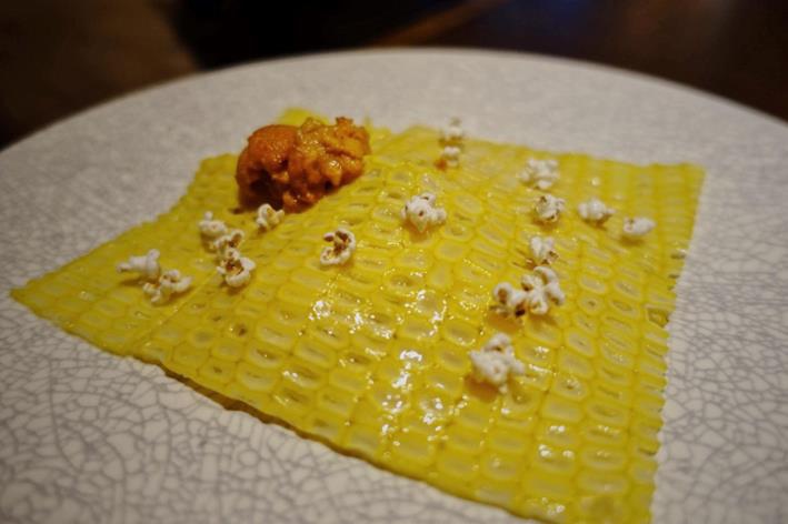 乍看之下主體像是帶有紋路的千層麵麵皮,想說也太厲害了把玉米的紋路整個仿製上去.沒想到它真的切成薄片的水果玉米,這樣的刀工直讓人覺得不可思議…水果玉米下覆蓋的是小顆的gnochi,溫泉蛋和海膽做的醬汁.又是一道食用前要把所有食材攪在一起的料理了.水果玉米非常非常的甜,甜到其實也吃不出海膽鮮不鮮美.除了點綴的高粱爆米花之外,裡面也還有像是爆過的薏仁的米香.蛋腥味蠻重的,所有的食物反而變得很分開不融合….GNOCHI是種用馬鈴薯加一點點麵粉做成的麵點,跟我們的麵疙瘩最大的不同是沒有筋度吃起來很鬆散..放在這道料理中沒有畫龍點睛之外還複雜化原本就不單純的口味跟口感….