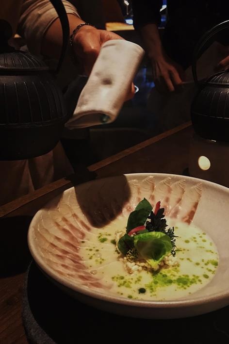 由於D不吃魚RAW將上頭的魚子醬換成了伊比利火腿,本來以為這應該會是種海陸的饗宴,但伊比利火腿最大的特色,豐厚具橡子風味的油脂卻破壞了整道菜新鮮帶著海風的感覺….