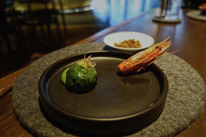 整體像是一個綠色的壽司,炙燒過的胭脂蝦(原本應該是生食)和著香甜的米飯包裹在極鮮嫩的菠菜葉中,正當季的茗荷則取代了紅薑片.帶有淡淡山葵辣味的甜豆泥就是WASABI了! 沾取了加了花椒的炒紅藜麥在口感中多添加了酥脆的感覺.旁邊的胭脂蝦新鮮只用薄鹽烤過,滿滿的蝦膏更增添海洋的風味.本應該直接用手取用,但因為不像日式壽司那麼扎實,還是建議用湯匙以免全部散落滿桌.