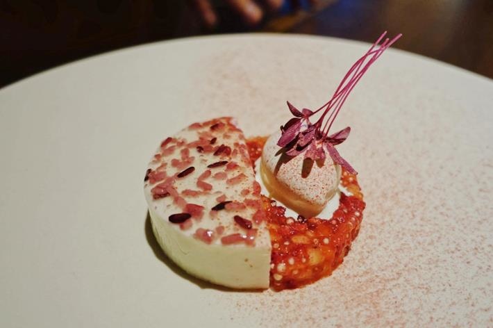 使用屏東小農牛乳製作的牛乳的五種型態,直接用手取用右邊的小塔,牛奶凝乳(有點像是RICOTTA CHEESE那類的軟性CHEESE) 上面加著刨絲的乳皮 (牛乳在變成CHEESE過程前產生的表皮)最頂端在撒上自製的CHEESE,一樣充滿牛乳濃郁的香氣卻有不同的口感和味道..仔細品嘗時發現中間似乎有種鹹且鮮的味道,才發現廚師在酥薄的塔皮和凝乳之間居然用上了海苔醬!意想不到的組合卻畫龍點睛的風味!相較於小塔,旁邊的乳清(生產凝乳時排出的水)和牛奶泡泡喝起來就像是加了水的優酪乳…不太吸引人