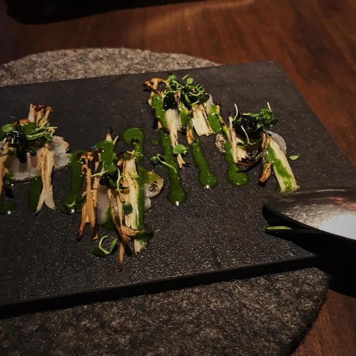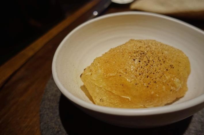 手工法式麵包比上次來訪大了不少,只用海鹽打發的奶油沾著可可和燕麥也一如記憶中的好吃,只是依舊不能理解的是為什麼麵包要另外付費呢?之前在同是米其林餐廳Marea不用付費吃完可以再續,續了沒吃完還可以打包帶走…而且沒有麵包盤真的很容易把桌子弄得很髒亂…