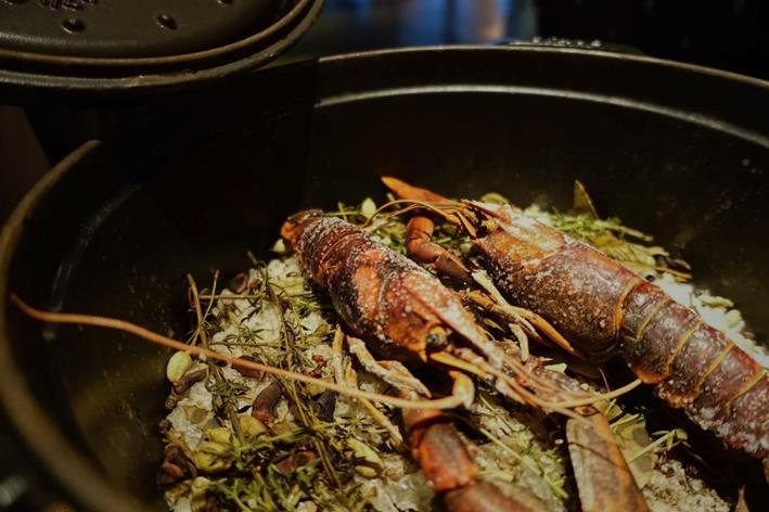 原來鐵鍋中是用各式香草鹽焗的嘉義鰲蝦.我以為只是上桌展示,之後會送回廚房去殼,沒想到是需要自己處理的,很硬的螯蝦殼的確有點難剝殼.