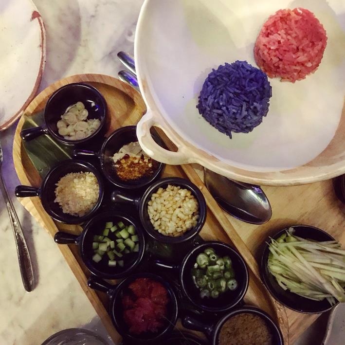 一道上桌女孩兒一定猛拍的吸睛餐點! 火龍果的粉紅蝶豆花的藍紫,完全的夢幻!加上13種新鮮蔬果,香料,香茅,葡萄柚,豌豆,辣椒粉,小黃瓜,肉鬆,青蘋果絲,椰肉,台灣冬蝦,米果,長豆,辣椒粉,特製醬汁.服務人員會做桌邊服務介紹每一種食材,幫忙做攪拌,最後淋上特製醬汁.