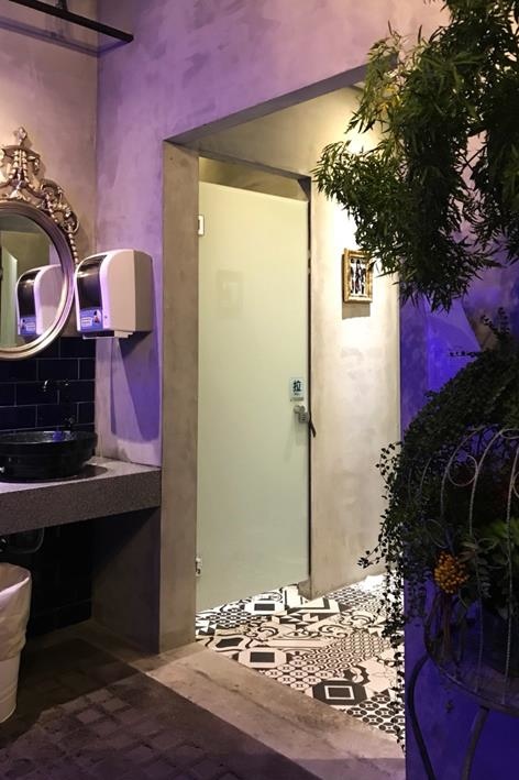 PS連廁所都做得這樣有情調啊!只是清水模的裝潢打上紫色的燈光再加上黑白花磚和植栽,氣氛就迷離了起來!