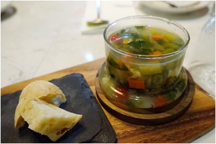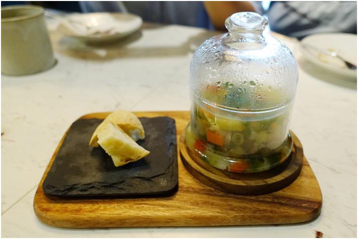 使用多種蔬菜經過慢火三小時的熬煮,煮出蔬菜內部的精華.透明的玻璃盅打開冒出一團煙霧更是有趣!