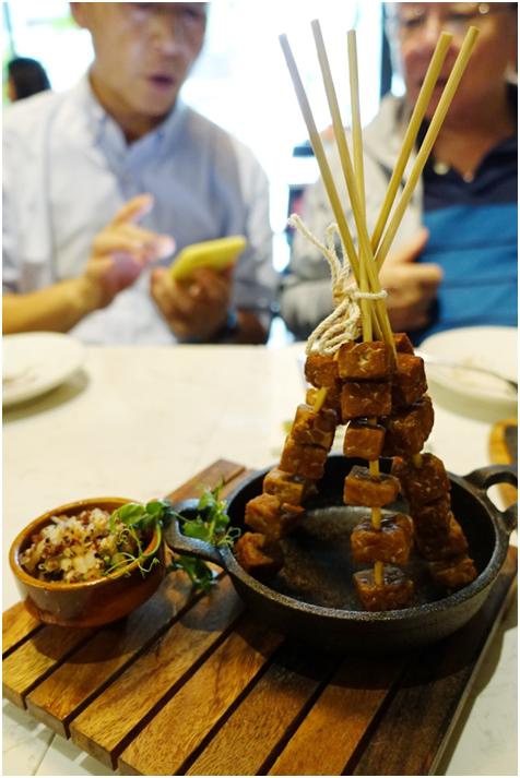小小像小方塊的東西連紋路看起來都很像肉,吃下去沒有中式素肉很假的感覺,反而連口感都和肉乾很像.原來是最近很紅的天貝!!!幾可亂真的味道和口感,如果不是知道自己是在素食餐廳還真的就被騙過了呢!!