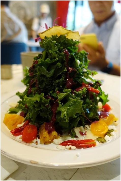 深綠帶著比較厚菜葉口感的羽衣甘藍綠油油的堆成一座小山,蔓越莓口味的醬汁酸甜,烤過南瓜子酥脆,藜麥有嚼勁,單吃是一種口味,混在一起又有不同的變化.是到多層次的沙拉.