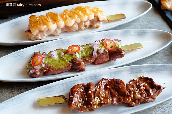 我流烤物的烤物都有股特殊的香氣,真心覺得跟使用的炭木一定有關係,它們家用的水果炭,淡淡炭味、香而不膩,而主廚烤功也算了得,牛肉軟而多汁、豬肉紮實甜味高,而雞肉則是嫩口帶有嚼勁,三種都好吃。