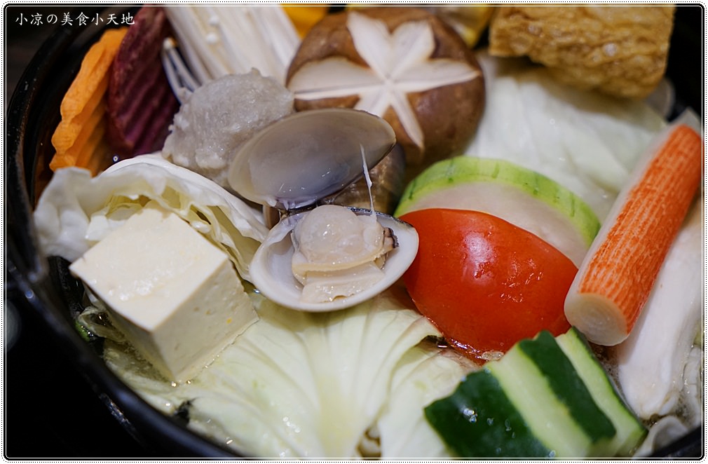 火鍋搭配的菜盤有高麗菜、大陸妹、金針菇、南瓜、紅蘿蔔、丸子、豆皮、玉米、鮮蝦、蛤蠣