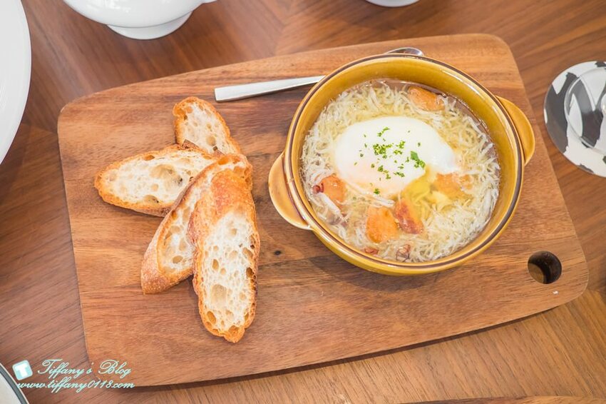 銀魚玉子油封蒜是用魩仔魚熬製而成的湯頭加入魩仔魚、蒜頭及溫泉蛋還有橄欖油