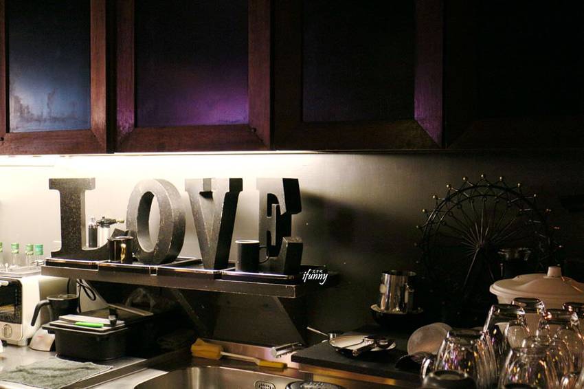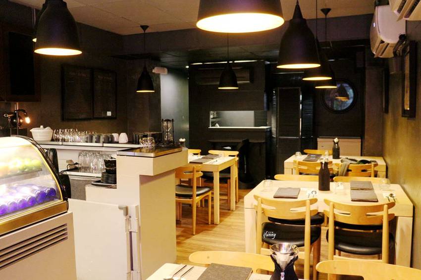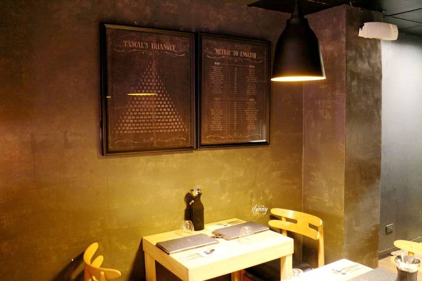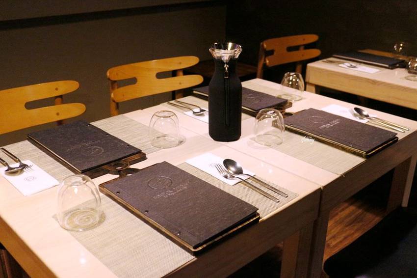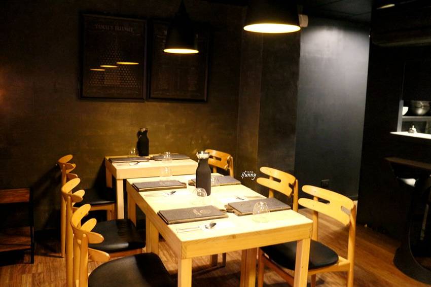 以黑色牆面及燈具,搭配木頭桌椅,加上桌上的擺設,沈穩既優雅。