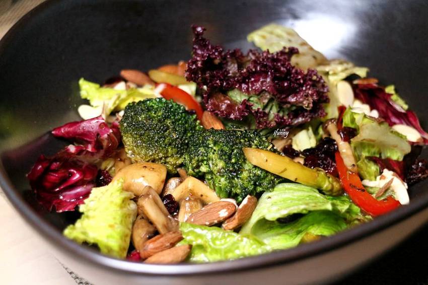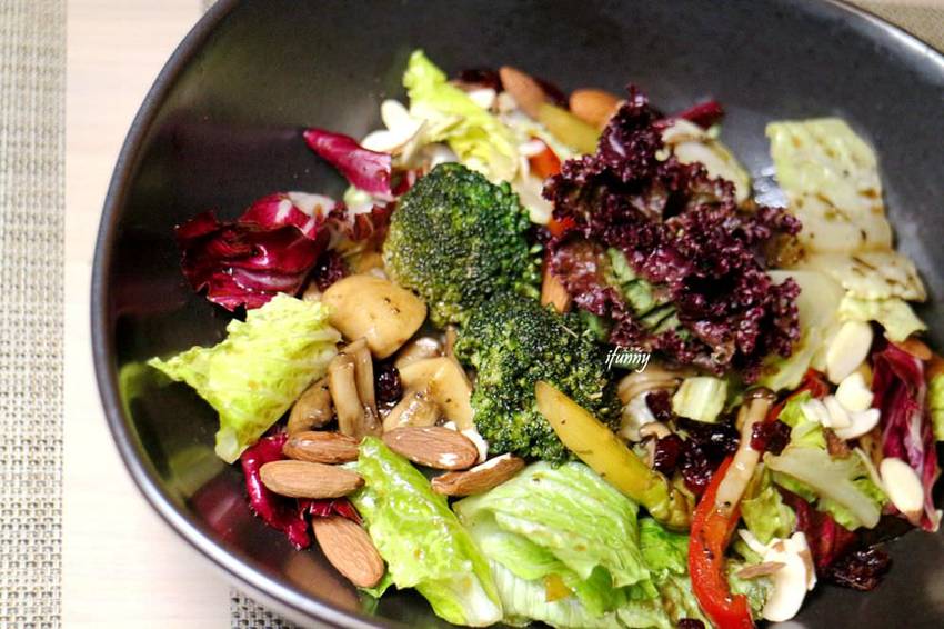 尤其是在多樣化且新鮮的生菜之中,加入了炒綜合野菇,那溫熱的口感及帶著黑胡椒的香氣,真的好棒!除此還有蘆筍、地瓜、櫛瓜、鷹嘴豆、黑橄欖、酸豆、蕃茄及杏仁豆,每一口的口感都不盡相同,卻又有別於一般清爽的沙拉,味道極佳又很開胃!