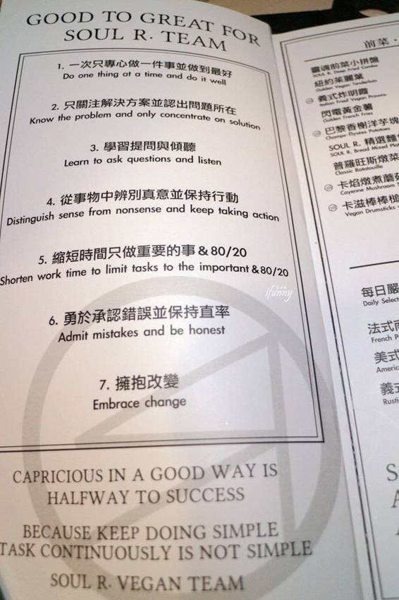 打開菜單令人感到佩服的地方,經營餐廳真的沒有想像中那麼容易!在Soul R. Vegan Café 靈魂餐廳的官方臉書或官網上都可以發現年輕又美麗的店主,為了推廣純素料理花了頗多心思,且積極投入社會公益,如此對接下來的餐點更是期待了!