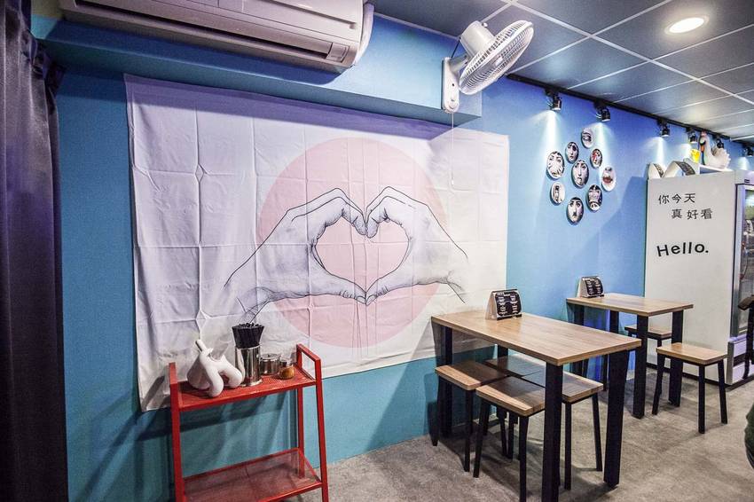 無敵食堂的用餐空間,粉嫩多彩的牆面搭配大布簾的圖案與標語圖案及店名,簡約但文青感十足