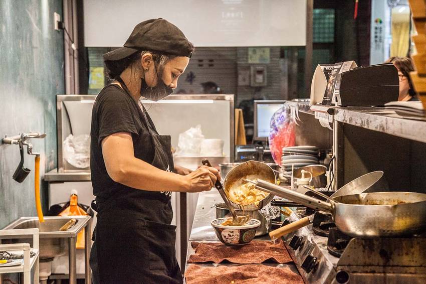 走進店裡正看到老闆娘正在忙乎著,所有料理都是現點現做,外面是開放式廚房的部分,可以直接看到料理的製作過程,穿過紅色的布簾後方才是用餐區
