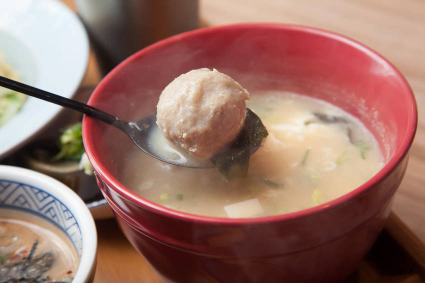 味增蛋花貢丸湯,台式涼麵的標配之一,味增湯打上蛋花加上海帶,不僅可以減低味增湯的鹹度,還可以增添湯頭的風味,裡面還加了兩顆貢丸,飽足感更加!