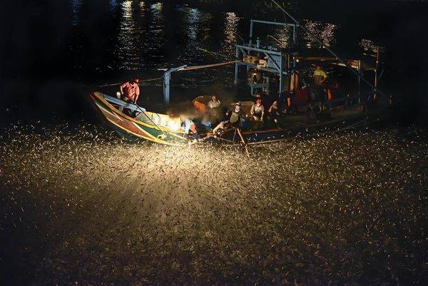 而船長會先關燈,不驚動魚兒游動,確認魚群地點之後,再進行磺火點燃,等待過程有時長達數小時,相當辛苦呢!