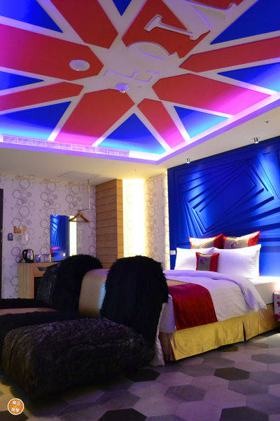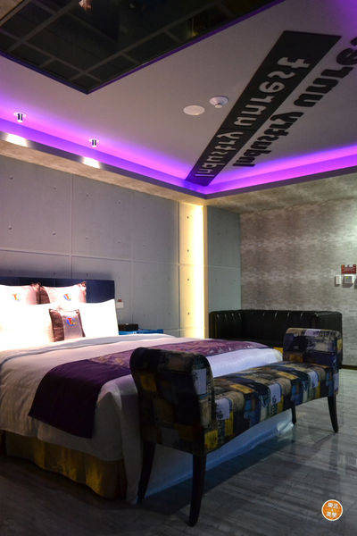 我今天住的這間有紫色花漾造型天花板,加上紅白線條點綴,透過間接燈帶來的浪漫情調,讓人一來就愛上,跟一般金山的旅店不太一樣,更多了許多裝潢巧思,相當細心!