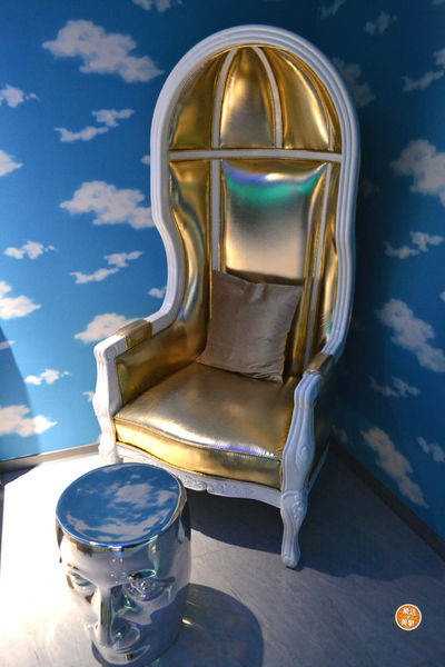 夢幻的天使房有著特製的天使椅,全區採用天空圖案壁貼,讓人感覺彷彿在空中,充滿祥和之感。