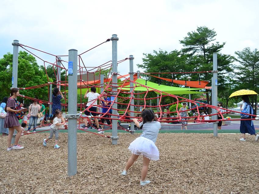 這裡還有攀爬網可以訓練手眼協調,不論從哪裡開始爬都可以,全台有許多大型攀爬網的公園,我覺得這真的很適合給小孩訓練,可以挑戰自己!