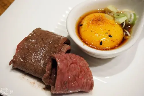 櫻桃鴨烤鴨上菜前於桌邊以蘋果酒火焰料理,逼出鴨油噴香佐以淡淡蘋果酒香,讓片皮鴨的口感更有層次。