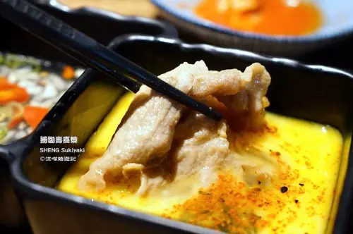 傳統壽喜燒吃法,可以沾上加了七味粉的蛋液,