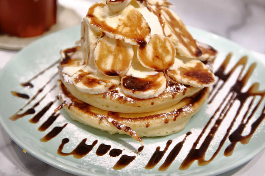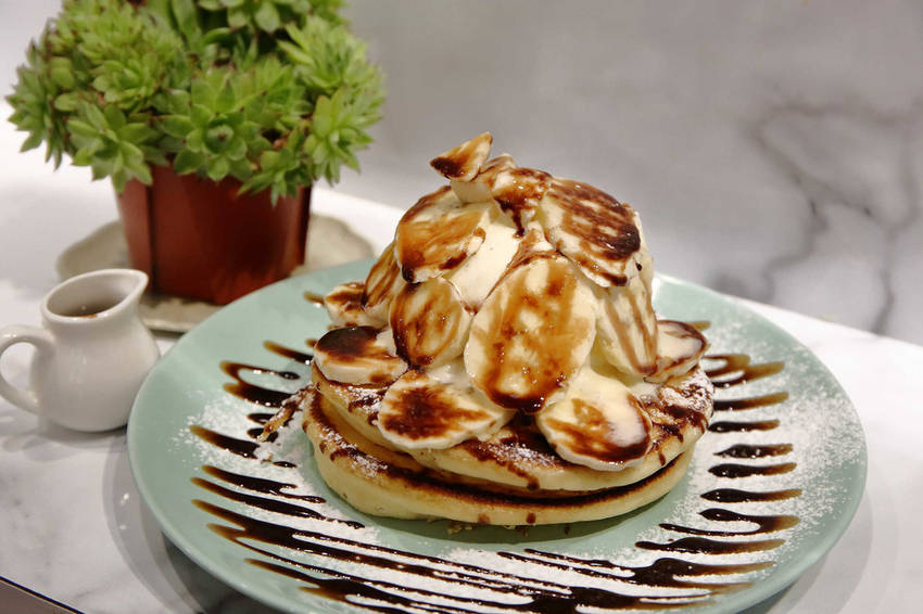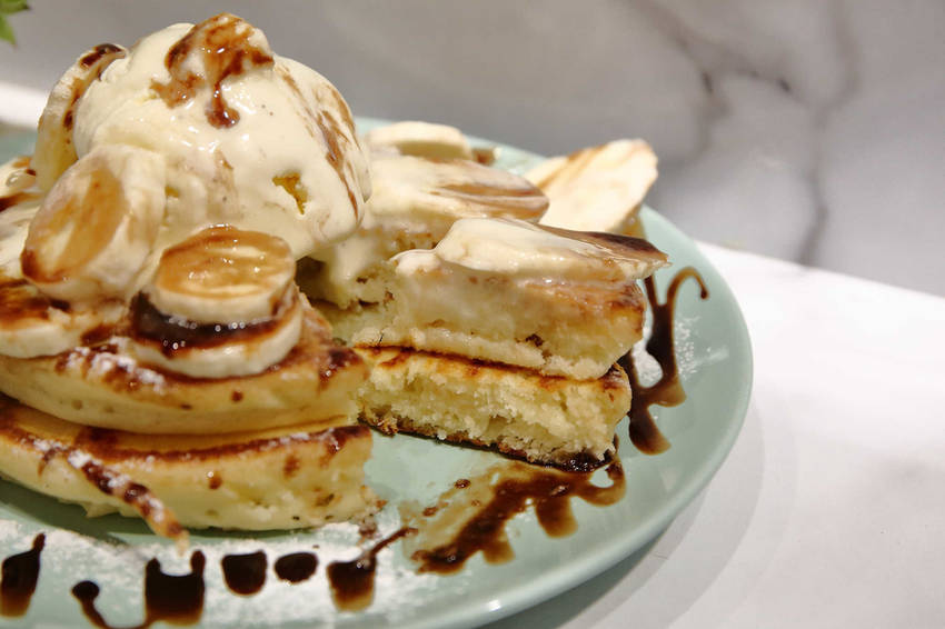 冰淇淋和香蕉放在鬆餅上頭一起入口,有冰火交融的口感,美味又滿足〜