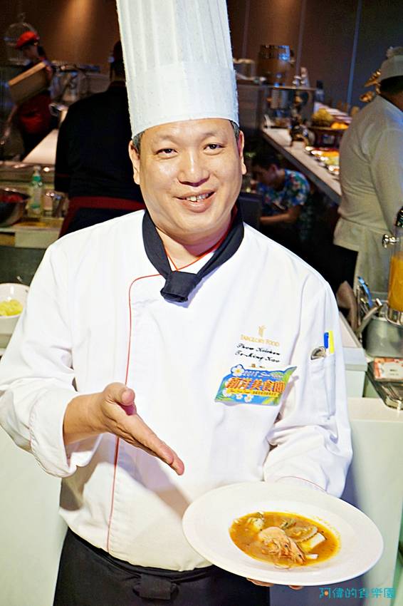 一進門是圓型櫃檯,上面電視中的人就是主廚高得明師傅,他曾在曼谷、首爾等地的國際美食比賽中,都拿下了很優異的成績。今夏使出渾身解數,結合泰國、越南、印尼、新加坡、馬來西亞等南洋國家經典小吃與道地傳統食物,推出「泰瘋Food」南洋美食節,酸酸甜甜的醬汁、新鮮的海鮮料理,都讓阿偉超喜歡的。