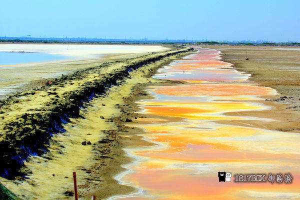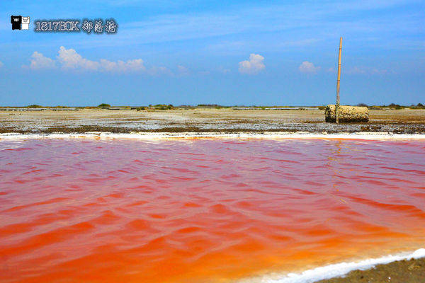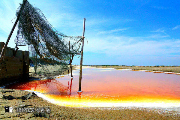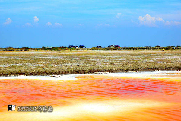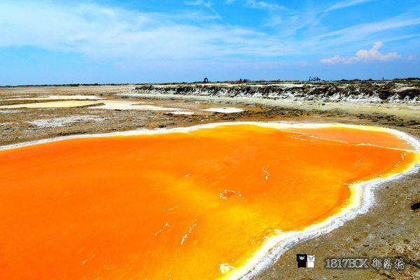 將車子停在路邊後步行進入廢鹽灘,先是看到一大池橘紅色的廢鹽水,