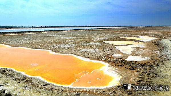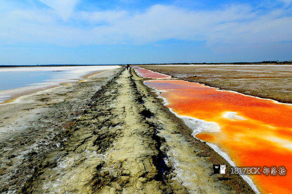 這條乾涸的廢鹽田田埂右邊是橘紅色,左邊是晶亮的雪白色,加上前方無盡的藍天,
