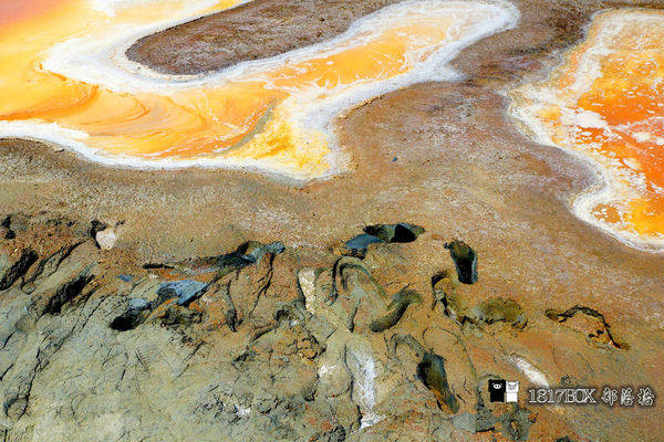 橘紅色的廢鹽水與乾涸的地面形成一幅幅特有的景觀,