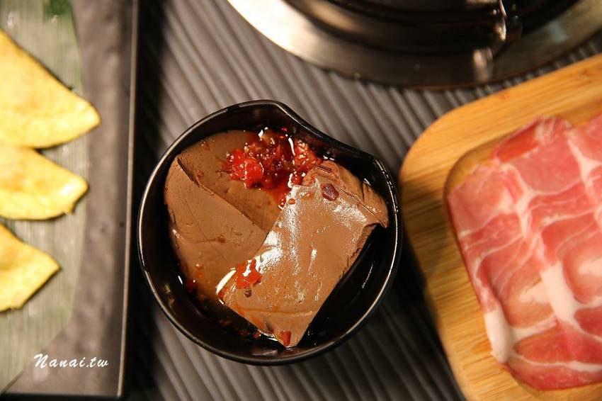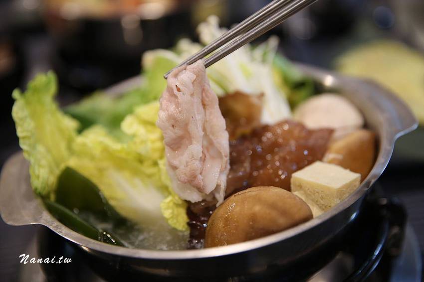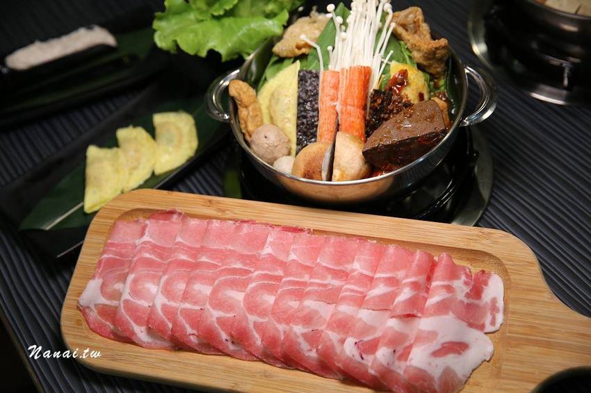 如果想喝兩種湯頭也OK,可選擇鴛鴦鍋的方式,鴛鴦鍋有四種湯底可選兩種,NANA選了麻辣與壽喜嚐鮮看看,右邊為麻辣湯頭用21種獨特的中藥材,以及台灣產的朝天椒,還有四川大紅袍花椒,溫火炒六小時,辣味香醇溫和,麻卻不嗆,另外上面還有一塊我愛的鴨血,一開始喝麻辣湯頭辣度剛剛好,但是越煮越辣,辣到嘴唇紅通通,辣的餘味卻很過癮,建議如果不敢喝太辣,可以自行加湯調整辣度。左邊為壽喜湯頭採用日式醬油、柴魚、老薑、洋蔥、白糖等食材,以四小時加上適當的火侯進行湯底熬煮,加入柴魚可提升口感的鮮度,建議可以拿來涮牛肉,入口後的牛肉帶有甘醇味,我個人比較不愛單喝湯頭,因為會比較鹹。