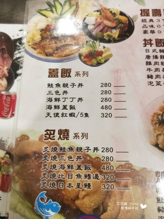 有蓋飯、炙燒、丼飯、握壽司、烤物、炒物、炸物、手捲、沙拉小菜、湯、酒及飲料