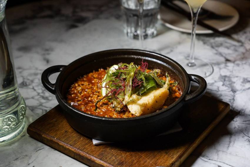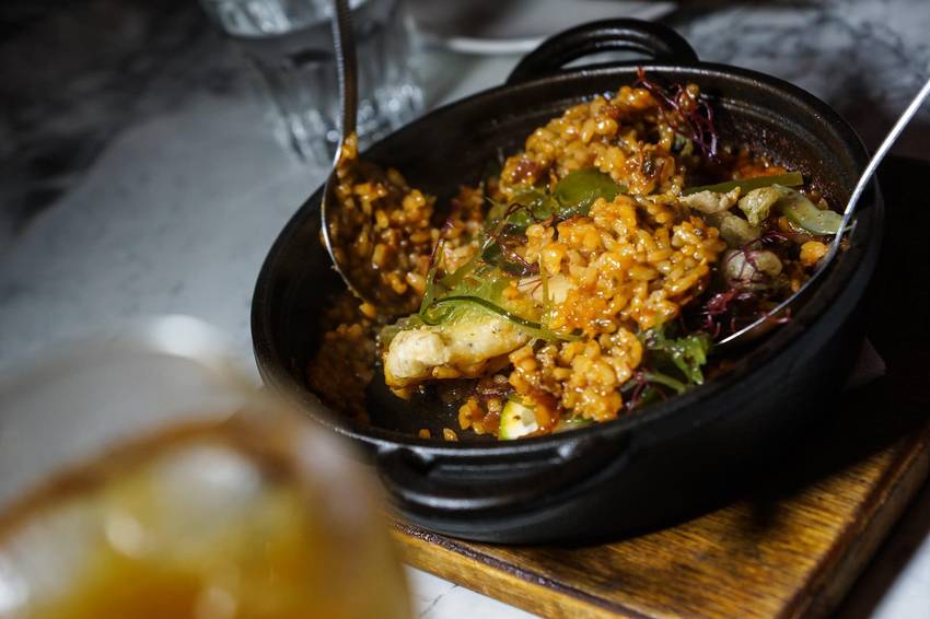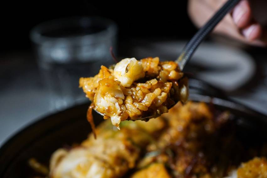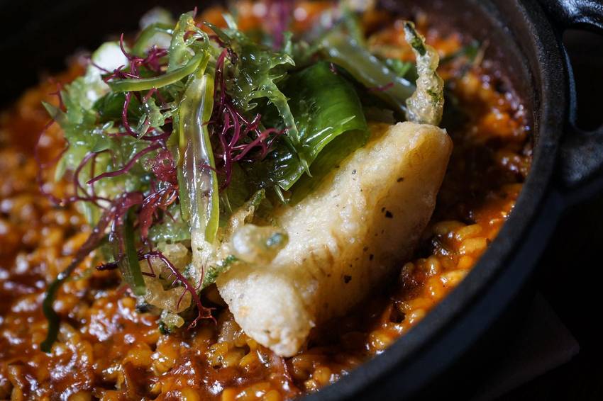 這烤飯歐奇也超推薦!!與印象中的西班牙海鮮燉飯很不一樣!以海鮮高湯與米飯一起炒至半生熟再送入烤箱火烤,因此米粒不但吸滿了炭香味,一粒一粒小小粒,帶有著硬度的口感。海鮮高湯濃郁的滋味使得烤飯味道算是偏重的。上方搭配油炸比目魚以及在台灣很少見的海蘆筍及海藻,股溜股溜的口感,替整體口感增添了趣味性。