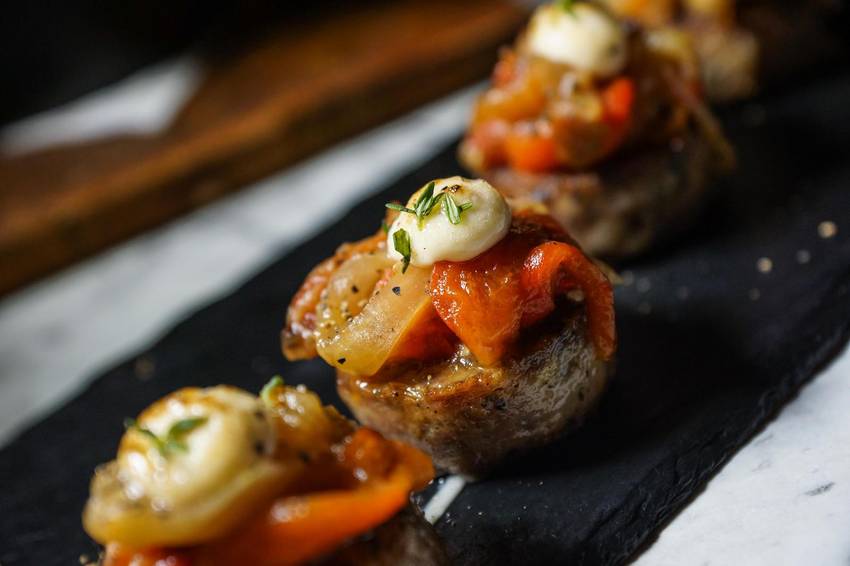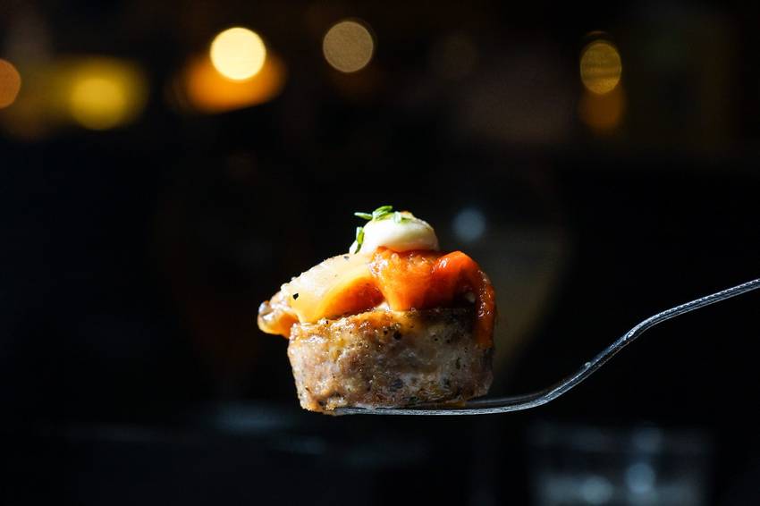 來自古羅馬時代所流傳下來的一種肉腸,在西班牙的加泰隆尼亞區很經典的代表菜色之一。以台灣豬肉、香料以及鷹嘴豆所自製的Butifarra肉腸,上方搭配炭甜椒、洋蔥、茄子等,最後畫龍點睛提味的是自製炭味美乃滋,整體來說是一道很特別的西班牙小點。