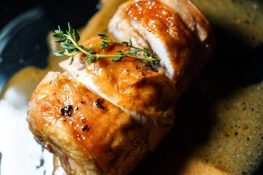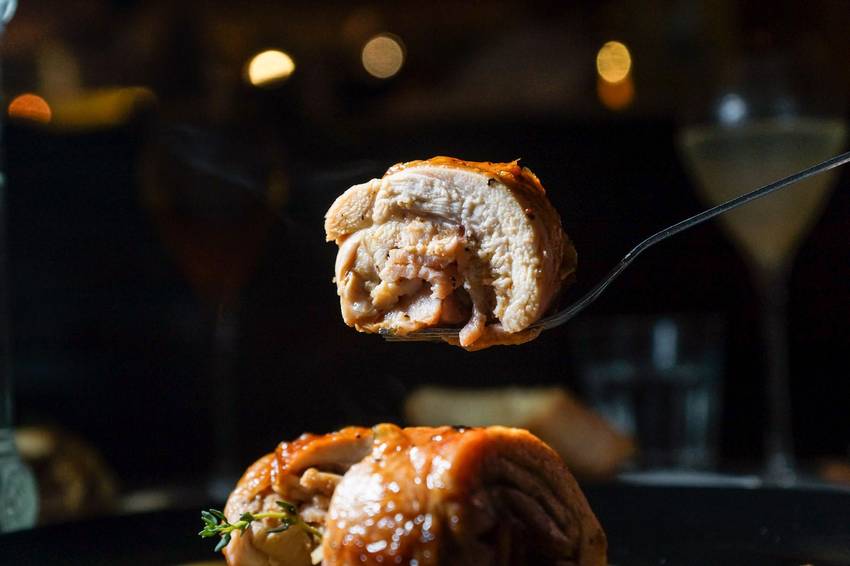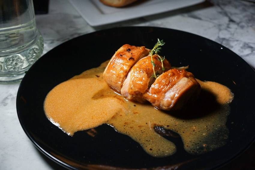 雞肉以雪莉酒和香料真空醃製,捲入培根後用舒肥機低溫烹煮,接著炭火烤箱煎烤至表面呈現好好看的焦褐色,淋上自製西班牙甜椒醬及醃製的香料酱汁,最後會輕巧的加入些許雪莉酒提味。