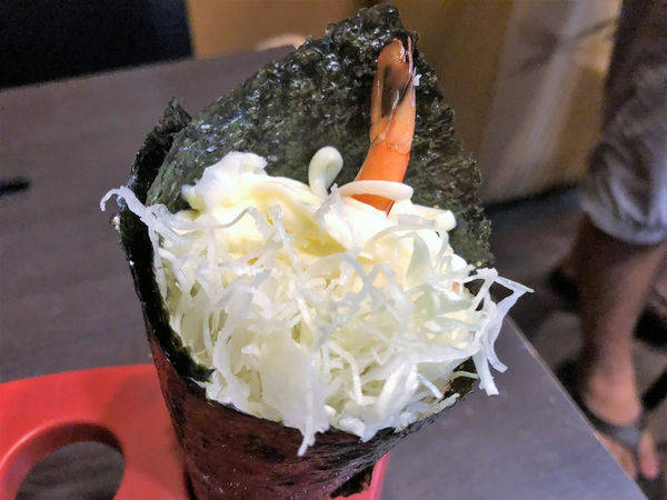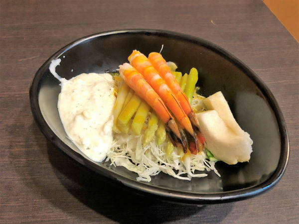 沙拉醬與蘆筍搭配還算合拍,蘆筍的味道剛好可以鎮壓沙拉醬的膩味,蘆筍好像比較少機會吃到,在日式料理運用上比較常見。
