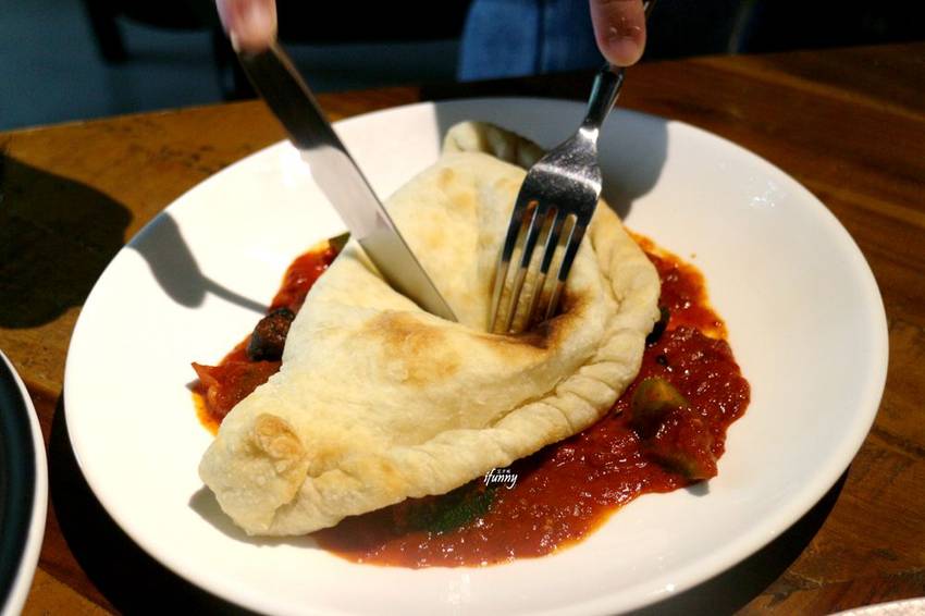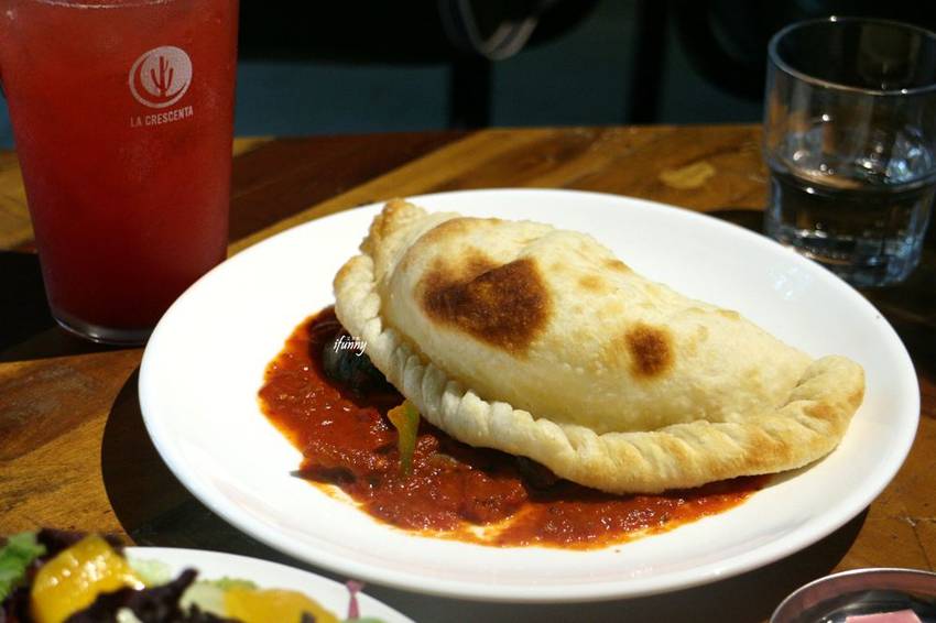 LaCrescenta披薩外表呈現半月形的披薩,本來以為是義大利的calzore比薩,那是一種把披薩餡料包在像餃子般的餅皮裡頭。