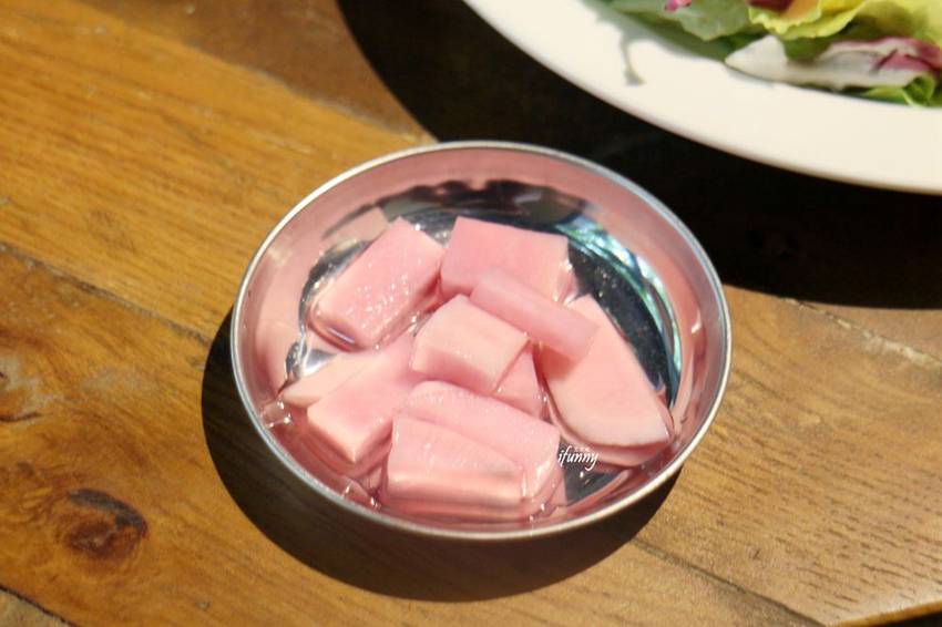 就如同一般韓式餐廳,一上桌先送上小菜,醃漬的蘿蔔輕脆可口。