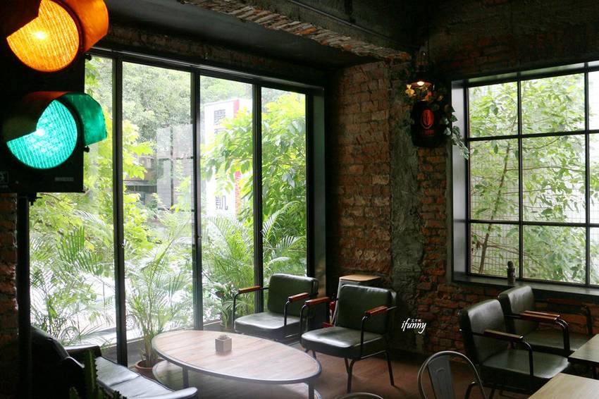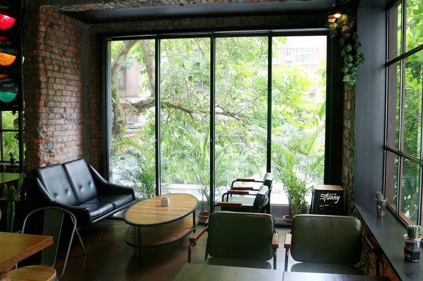 落地窗加上裸露的紅磚牆,復古沙發加上滿窗的綠意,這真的一下子就黏在此地不想離開了!